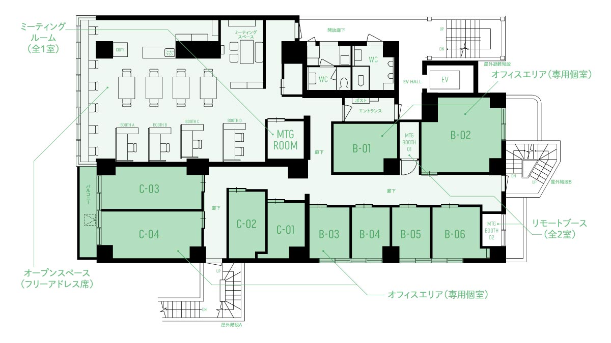 オフィスエリアへ向かうと、カラフルなドアが並んでいたり、入り組んだ通路がまるで秘密基地のよう。その雰囲気には何か不思議なワクワク感があります。各室とも広めの空間を確保していますので、人数や用途に合わせてお部屋をお選びください。